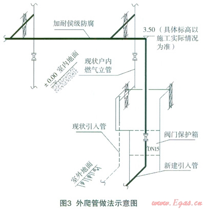 針對老舊小區(qū),戶內(nèi)立管往往位于居民室內(nèi)裝修或者包封內(nèi),改造難度較大或者不存在改造的可能性,可采用將引入管改至與首層立管相接處的方式,而不改造原有燃?xì)饬⒐?。如果存在地上引入口被占壓的情況,而且占壓物不便于拆除時,可采用樓前管采用外爬墻方式敷設(shè),外爬管在樓房燃?xì)饬⒐芩趥?cè)爬至二層樓的0.5m高處,分別與現(xiàn)狀燃?xì)饬⒐芟嘟?,如圖3所示。
