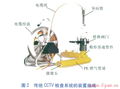 傳統(tǒng)CCTV檢查系統(tǒng)的裝置組成見圖2。經(jīng)導(dǎo)向管、轉(zhuǎn)換閥門、鞍形旁通管件后攝像頭進(jìn)入PE燃?xì)夤艿纼?nèi),攝像頭的前進(jìn)動力來自電纜線。電纜線內(nèi)置電源線、影像信號線、接地線:電源線為攝像頭(包括照明裝置)供電,信號線把影像傳回顯示器并儲存在儲存器上,接地線為防止攝像頭移動過程中出現(xiàn)放電現(xiàn)象。攝像頭、電纜線均采用防水、防爆設(shè)計(jì),既不會因觸水而損毀,也不會引起燃?xì)獗肌?span lang="EN-US">