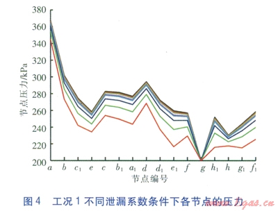 本次TGNET模擬計(jì)算的邊界條件如下:氣源點(diǎn)入口壓力最大為400kPa,負(fù)荷點(diǎn)最小壓力不低于200kPa,泄漏點(diǎn)為直徑為20mm的孔洞,并通過(guò)對(duì)泄漏系數(shù)的設(shè)定模擬不同的泄漏量。本文模擬了泄漏系數(shù)為2.5%、5%、l0%、l2.5%、25%、50%以及100%等7種不同的泄漏情況。