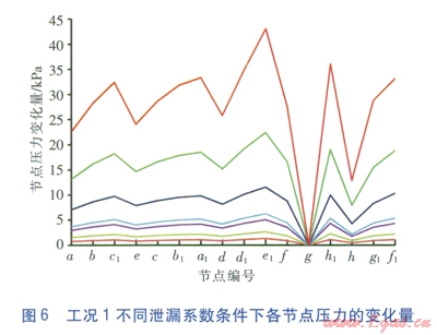 隨著泄漏量的增加,管段1、管段9的流量都增加,管段l的流量變化量比管段9大。泄漏工況時(shí),管段5、管段6、管段16的流量有明顯的增大,管段8、管段23的流量逐漸減小,說(shuō)明主供氣路線開(kāi)始發(fā)生偏移。