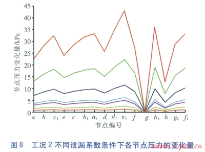 對(duì)圖4中的數(shù)據(jù)進(jìn)行處理求得工況l不同泄漏系數(shù)條件下各節(jié)點(diǎn)壓力相對(duì)于正常工況壓力的變化量,即正常工況時(shí)節(jié)點(diǎn)的壓力減去泄漏工況時(shí)節(jié)點(diǎn)的壓力,見(jiàn)圖6。