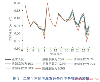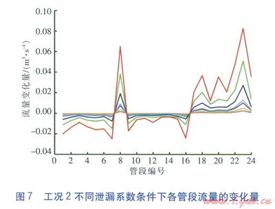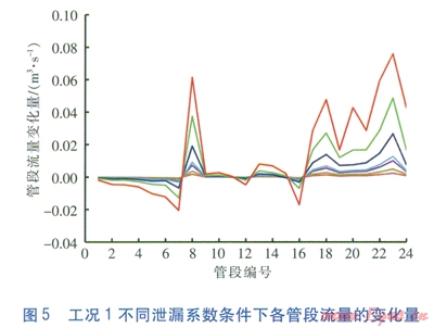 對(duì)上述數(shù)據(jù)進(jìn)行處理,求得工況l不同泄漏系數(shù)條件下各管段流量相對(duì)于正常工況流量的變化量,即正常工況時(shí)管段的流量減去泄漏工況時(shí)管段的流量,見(jiàn)圖5。
