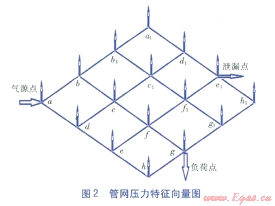 管網(wǎng)具有不同的運(yùn)行工況時(shí),如單氣源點(diǎn)或者多氣源點(diǎn)管網(wǎng)以及氣源點(diǎn)位置不同,單負(fù)荷點(diǎn)或者多負(fù)荷點(diǎn)以及負(fù)荷點(diǎn)位置不同,管網(wǎng)的壓力特征向量圖都是不同的,管網(wǎng)不同的環(huán)、不同的位置出現(xiàn)泄漏時(shí)對(duì)壓力特征向量的影響更是不同。在大量模擬數(shù)據(jù)以及實(shí)驗(yàn)數(shù)據(jù)的基礎(chǔ)上,對(duì)各種不同工況下的泄漏進(jìn)行分析,可以依據(jù)壓力特征向量圖對(duì)其是否發(fā)生泄漏以及泄漏點(diǎn)位置進(jìn)行判定[2]。