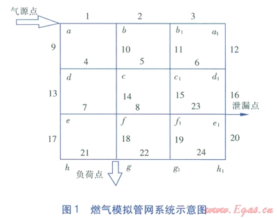 燃?xì)夤芫W(wǎng)泄漏檢測(cè)系統(tǒng)以模仿城市中壓燃?xì)夤芫W(wǎng)為主,可進(jìn)行泄漏檢測(cè)、泄漏點(diǎn)快速定位、SCADA系統(tǒng)監(jiān)測(cè)點(diǎn)選取及優(yōu)化等實(shí)驗(yàn)。該系統(tǒng)管網(wǎng)采用公稱直徑為40mm,壁厚為3mm的U-PVC管搭建,每根管段的當(dāng)量長(zhǎng)度均為26m,粗糙度為0.003mm[1]。在實(shí)際的實(shí)驗(yàn)室模擬實(shí)驗(yàn)中,采用空氣代替燃?xì)庾鳛檫\(yùn)行介質(zhì)。將燃?xì)饽M管網(wǎng)系統(tǒng)中各節(jié)點(diǎn)用a~h,a1~h1表示,各管段用l~24表示。燃?xì)饽M管網(wǎng)系統(tǒng)示意圖見(jiàn)圖1。