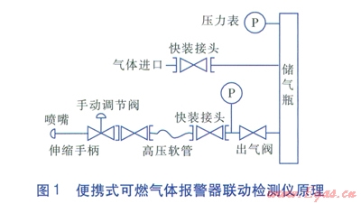 便攜式可燃?xì)怏w報(bào)警器聯(lián)動(dòng)檢測(cè)儀是一種用于檢測(cè)可燃?xì)怏w報(bào)警器工作狀態(tài)的裝置,它可以用指定濃度的可燃?xì)怏w(以下簡(jiǎn)稱標(biāo)準(zhǔn)氣體)對(duì)報(bào)警器進(jìn)行檢測(cè),這樣既能夠測(cè)試報(bào)警器的工作狀態(tài)是否正常,同時(shí)還不對(duì)傳感器等靈敏部件造成損壞,其原理見(jiàn)圖l。