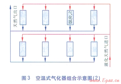 空溫式氣化器的臺數(shù)和氣化量,可跟據(jù)工程建設(shè)規(guī)模和用戶的要求綜合確定??諟厥綒饣鹘M合示意見圖2、3。