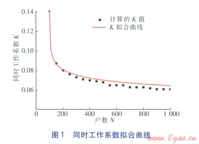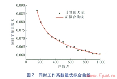 此式仍然滿足同時(shí)工作系數(shù)的一般規(guī)律,而且加冪運(yùn)算使得K隨Ⅳ的變化而變化的敏感性提高。當(dāng)置信區(qū)間P較小時(shí),計(jì)算誤差對(duì)整個(gè)運(yùn)算的影響逐漸減小,故而造成的波動(dòng)也越來(lái)越小。針對(duì)此地區(qū)的同時(shí)工作系數(shù)在置信區(qū)間P=[0.99,1)時(shí),將計(jì)算出來(lái)的離散數(shù)據(jù)擬合成曲線的函數(shù)關(guān)系,將表1中的數(shù)據(jù)作為依據(jù)進(jìn)行擬合,得到戶數(shù)與同時(shí)工作系數(shù)的擬合結(jié)果,見圖1。