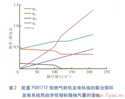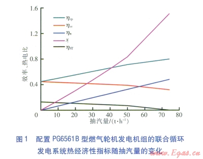 燃?xì)廨啓C(jī)發(fā)電機(jī)組在額定工況下運行,改變汽輪機(jī)抽汽量,配置兩種燃?xì)廨啓C(jī)發(fā)電機(jī)組的聯(lián)合循環(huán)發(fā)電系統(tǒng)的熱經(jīng)濟(jì)性指標(biāo)分別見圖l、2。