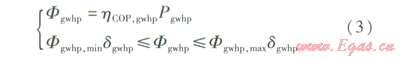 考慮機(jī)組輸出功率的上下限,并假定機(jī)組性能系數(shù)(hCOP,gwhp)保持不變,采用如下模型: