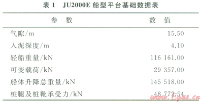 以現(xiàn)今主流的400Ft自升式JU2000E船型為基礎(chǔ)建立等效有限元模型,選取我國(guó)東海黃巖海域?yàn)槟M環(huán)境海區(qū),平臺(tái)自身性能參數(shù)如表l所示,海區(qū)環(huán)境參數(shù)基本數(shù)據(jù)如表2所示。