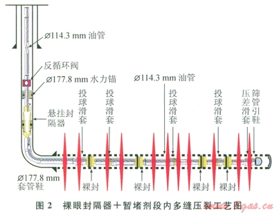 段內(nèi)多縫體積壓裂可以有效動用不同滲透率級別層段,在儲層中形成一定程度的復(fù)雜縫網(wǎng),進(jìn)一步增加改造體積,從而提高單井產(chǎn)量和采收率[9-10]。具體做法是在水平井裸眼完井條件下一次性下入水平井裸眼分段壓裂管柱,段內(nèi)加暫堵劑實(shí)現(xiàn)段內(nèi)多縫,逐級投球打開滑套并封堵下層油管,實(shí)現(xiàn)水平井裸眼段多級多段壓裂改造規(guī)模(圖2)。