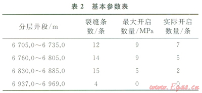從圖l中看出,壓裂改造井段6695.5~6983m。總跨度287.5m,共有天然裂縫46條,裂縫傾角基本分布范圍為l5°~85°,其中6830m以深以低角度縫為主,6800m以淺以高角度縫相對較多,由于跨度較大,難以實(shí)現(xiàn)一次性壓裂,因此,根據(jù)儲(chǔ)層物性及天然裂縫發(fā)育情況采用分層壓裂方式。