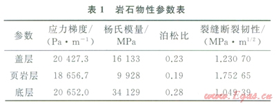 A井垂深2380m,水平井段長(zhǎng)l828m,目標(biāo)頁巖層在2370~2397m,層厚27m,基質(zhì)滲透率為0.002mD,各層巖石物性參數(shù)如表1所示;本井共進(jìn)表1巖石物性參數(shù)表行了七級(jí)清水壓裂,每一級(jí)有5簇射孔段,每一簇含8個(gè)射孔孔眼;選擇100目石英砂作為支撐劑,假設(shè)支撐劑在所有裂縫中均勻分布,沉降速率為1.27mm/min。兩個(gè)模型均假設(shè)縫網(wǎng)由兩簇分別垂直于最大、最小水平主應(yīng)力的垂直縫組成,不含水平縫。