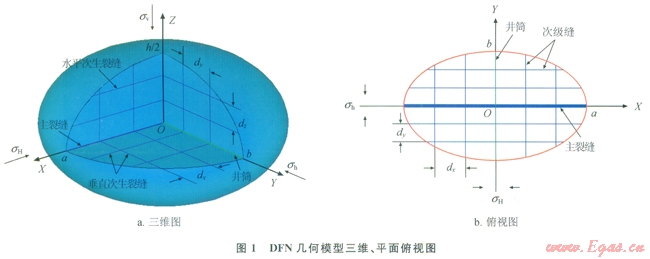 DFN模型基本假設(shè)如下:①壓裂改造體積為2a×2b×h的橢球體,由直角坐標(biāo)系XYZ表征,X軸平行于最大水平主應(yīng)力(sH)方向,Y軸平行于最小水平主應(yīng)力(sh)方向,Z軸平行于垂向應(yīng)力(sv)方向;②包含一條主裂縫及多條次生裂縫,主裂縫垂直于sh方向,在X-Z平面內(nèi)擴(kuò)展,次生裂縫分別垂直于X、Y、Z軸,縫間距分別為dx、dy、dz;③考慮縫間十?dāng)_及壓裂液濾失;④地層及流體不可壓縮。基于以上假設(shè),作出DFN模型幾何模型的示意圖(圖1)。