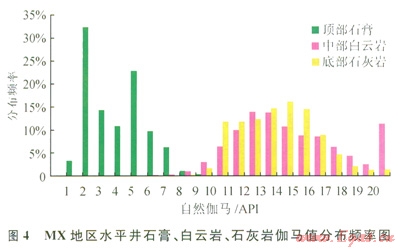 伽馬值衡量的是地層中放射性物質(zhì)含量,對儲層判別基本不起作用。但根據(jù)MX地區(qū)區(qū)域資料,自然伽馬能有效識別出儲層頂部石膏層。如圖4所示,頂部石膏的伽馬值主要集中在1~8API,而中部白云巖的伽馬值主要集中在8~20API,底部石灰?guī)r的伽馬值主要集中在9~l8API,石灰?guī)r、白云巖與石膏的差異非常明顯。可用8API作為石膏的輔助判別上限。