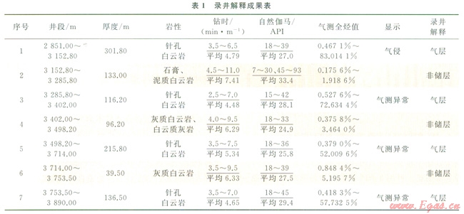 2號層:碳酸鹽巖分析酸不溶物含量明顯增加,巖屑為石膏、泥質(zhì)白云巖、灰質(zhì)白云巖,伽馬值呈中間高(50~90API),兩邊低特征(7~11API)。鉆時明顯增高,平均為7.41min/m,全烴值基本小于l%,錄井解釋為非儲層。