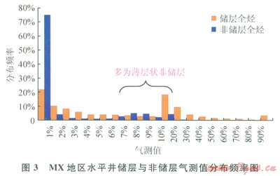 氣測值的影響因素頗多,用以判別儲層存在很大難度。但通過統(tǒng)計分析發(fā)現(xiàn),在MX地區(qū)的水平井,由于儲層段的平均孔隙度較高,其含氣量與非儲層存在明顯差異,加之MX地區(qū)屬于勘探成熟區(qū)塊且構(gòu)造平緩,使用的鉆井液性能基本一致,氣測值能有效地反映水平井儲層的發(fā)育狀況。