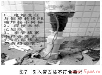 在燃?xì)夤艿朗┕み^(guò)程中,因施工單位人員、現(xiàn)場(chǎng)監(jiān)理人員以及建設(shè)單位現(xiàn)場(chǎng)管理人員對(duì)燃?xì)夤艿腊惭b施工質(zhì)量監(jiān)管不到位,施工經(jīng)驗(yàn)不足或者根本不懂燃?xì)夤艿朗┕さ闹匾?,不按照燃?xì)庑袠I(yè)國(guó)家規(guī)范和行業(yè)標(biāo)準(zhǔn)嚴(yán)格操作和監(jiān)管,產(chǎn)生一系列施工質(zhì)量隱患。如鋼管防腐處理不到位、閥井內(nèi)波紋補(bǔ)償器受外力安裝偏斜或不同軸,電熔管件焊接焊口冷卻采取沖水冷卻方式,PE管道運(yùn)輸、搬運(yùn)造成管壁劃傷嚴(yán)重超標(biāo)等人為因素,給城市燃?xì)夤艿腊踩\(yùn)行種下了一顆顆定時(shí)炸彈(如圖3、4、5)。