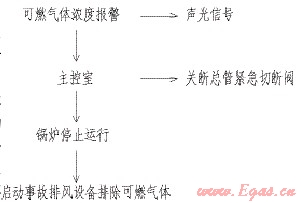 防爆場所的通風一般有兩種方式:自然通風、機械通風。自然通風由建筑專業(yè)設(shè)計考慮。機械通風由暖通專業(yè)設(shè)計考慮。在燃氣鍋爐房內(nèi)設(shè)計可燃氣體濃度報警裝置和火災報警裝置??扇細怏w濃度報警裝置按照可燃氣體爆炸下限20%設(shè)置報警點,其控制過程如下: