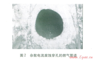 雜散電流腐蝕穿孔速度快,影響范圍廣,且隨機性強。雜散電流腐蝕創(chuàng)面光滑,邊緣較整齊,產(chǎn)生黑色腐蝕產(chǎn)物。修復(fù)方式同細菌腐蝕,但應(yīng)注意多數(shù)雜散電流腐蝕并不單一出現(xiàn)。圖2為某搶修現(xiàn)場雜散電流腐蝕穿孔的燃氣管道。