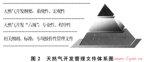 在借鑒國外天然氣開發(fā)理念和總結數(shù)十年開發(fā)經(jīng)驗教訓的基礎上,編制并頒布實施《天然氣開發(fā)管理綱要》,并構建了以該《綱要》為主的3個層次天然氣開發(fā)管理文件體系(見圖2):①系統(tǒng)性、宏觀性的管理文件;②專業(yè)性、程序性的管理文件;③專項操作性的管理文件。管理文件體系的建立,對天然氣開發(fā)全過程提出明確要求,進一步規(guī)范了天然氣開發(fā)各項管理工作,理順各專業(yè)管理工作界面和關系,明確了氣田開發(fā)各階段的主要工作內(nèi)容、程序和技術要求,形成不同層次管理人員和各環(huán)節(jié)現(xiàn)場操作人員操作程序與技術標準。天然氣開發(fā)全面實現(xiàn)制度化、科學化、全過程可控化管理。