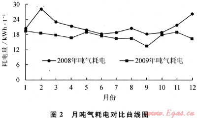 圖2為2008年和2009年LNG接收站月噸氣耗電對比圖,2009年的月平均噸氣耗電指標相應(yīng)下降,但年度用氣高峰階段5~11月份的下降幅度低于12~4月份年度用氣低谷階段。