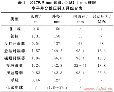 裸眼水平井分段壓裂需要的主要工具類型和參數(shù)見(jiàn)表1。按國(guó)際標(biāo)準(zhǔn),投球滑套內(nèi)通徑采用6.3mm梯度,分段級(jí)數(shù)小于等于6級(jí),采用3.175mm梯度,分段級(jí)數(shù)可達(dá)到10級(jí)[1]。