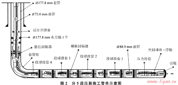 為了讓裂縫在壓裂段能集中起裂,蘇里格氣田多數(shù)以雙封隔器進(jìn)行單段壓裂,例如分5段使用8個(gè)裸眼封隔器,其壓裂施工管柱結(jié)構(gòu)如圖2所示,反打開(kāi)滑套可在壓裂施工前打開(kāi),施工時(shí)以便監(jiān)測(cè)井底壓力。