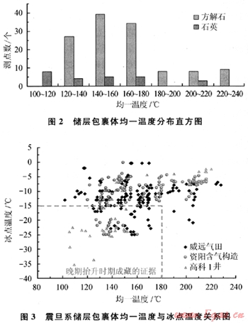 從威遠(yuǎn)、資陽地區(qū)震旦系儲(chǔ)層以方解石為宿主礦物的包裹體均一溫度分布看,均一溫度分布在120~180℃的占絕對(duì)優(yōu)勢(shì),同時(shí)也檢測(cè)到大于180℃的高溫包裹體(圖2)。而從均一溫度與冰點(diǎn)溫度的相關(guān)關(guān)系(圖3)分析,均一溫度分布在120~180℃的包裹體,其冰點(diǎn)溫度有很大的差異,這實(shí)際上反映了兩期烴類的充注,即印支期液態(tài)烴類的充注(低溫高冰點(diǎn))和晚期地層抬升剝蝕過程中氣態(tài)烴類的充注(低溫低冰點(diǎn))。大于180℃的高溫包裹體主要反映了地質(zhì)歷史時(shí)期中地層深埋、液態(tài)烴類發(fā)生裂解的燕山期。石英礦物中所檢測(cè)到的包裹體數(shù)量雖然不多,但其均一溫度分布范圍大,從102~206℃。