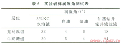 水相圈閉是制約致密砂巖氣井產(chǎn)能的重要因素,毛細(xì)管自吸和液相滯留則是產(chǎn)生水相圈閉的主要原因[19]。與致密砂巖儲(chǔ)層相比,貞巖儲(chǔ)層具有更為發(fā)育的微裂縫系統(tǒng),更高的毛細(xì)管力。并且由于頁巖富含有機(jī)質(zhì)等性質(zhì),巖石也具有明顯親油性質(zhì)(表6)。多種因素的共同作用,使得頁巖對(duì)油相具有顯著的自吸及滯留作用[20-22]。油基鉆井完井液濾液的自吸實(shí)驗(yàn)表明,干巖樣的自吸飽和度為38%~48%(圖2)。油相飽和度大幅度增加,大量濾液吸附滯留在孔道之中而難以返排,勢(shì)必導(dǎo)致氣相滲透率降低,產(chǎn)生油相圈閉損害。