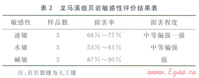龍馬溪組頁巖的流體儲(chǔ)層敏感性為中等偏強(qiáng)強(qiáng),其中堿敏臨界pH值儀為7,損害率可達(dá)90%(表2)。儲(chǔ)層應(yīng)力敏感性系數(shù)為0.48~0.62,應(yīng)力敏感程度為中等。