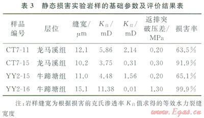 靜態(tài)損害實(shí)驗(yàn)的濾液為TGl6-WS高速離心機(jī)將原漿在6000r/rain下離心分離固相并過濾后得到。實(shí)驗(yàn)通過巖樣在濾液損害前(Kf1)與損害后(Kf2)的克氏滲透率變化,評(píng)價(jià)損害程度,具體實(shí)驗(yàn)步驟請(qǐng)參閱本文參考文獻(xiàn)[8]。