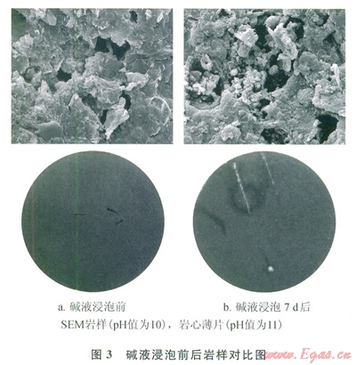 敏感性實(shí)驗(yàn)表明頁巖具有強(qiáng)堿敏(表2),堿液浸泡實(shí)驗(yàn)進(jìn)一步證實(shí)了堿液與巖石礦物間的強(qiáng)烈作用(圖3)。堿液浸泡前,巖樣宏觀和微觀上的孔隙結(jié)構(gòu)均保存完整,表面整潔;但浸泡后,巖心薄片上的微裂縫明顯擴(kuò)展,見乳白色溶蝕物質(zhì)充填;SEM圖像顯示孔隙結(jié)構(gòu)已經(jīng)受到嚴(yán)重破壞,見大量溶蝕微粒堵塞原有孔隙。實(shí)驗(yàn)巖樣富含堿敏礦物(表1),當(dāng)高pH值的油基鉆井完井液濾液侵入裂縫后,大量的溶蝕微粒以及氫氧根與某些二價(jià)陽離子結(jié)合生成不溶物,勢(shì)必堵塞滲流通道,降低裂縫滲透率[12]。