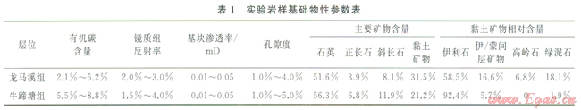 實(shí)驗(yàn)巖樣為四川盆地龍馬溪組和牛蹄塘組頁巖,基礎(chǔ)物性參數(shù)見表l。該2組地層均是古生代海相沉積形成的富有機(jī)質(zhì)頁巖,后期經(jīng)歷了大幅度的構(gòu)造抬升和強(qiáng)烈的地質(zhì)改造作用[3]。地層硬脆性特征明顯,微裂縫發(fā)育,常見于石英、長(zhǎng)石等骨架顆粒間以及云母片中。裂縫面溶蝕作用明顯,常見黏土礦物呈片狀、絮狀充填以及方解石充填。