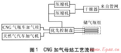 進(jìn)站計(jì)量和脫水裝置設(shè)在壓縮機(jī)前,起到計(jì)量和凈化作用。天然氣經(jīng)壓縮機(jī)加壓后進(jìn)入儲(chǔ)氣瓶組或者通過(guò)加氣柱、加氣機(jī)為車輛加氣。優(yōu)先控制盤則對(duì)整個(gè)加氣站及加氣過(guò)程進(jìn)行控制。空壓機(jī)為站內(nèi)氣動(dòng)閥提供壓縮空氣。