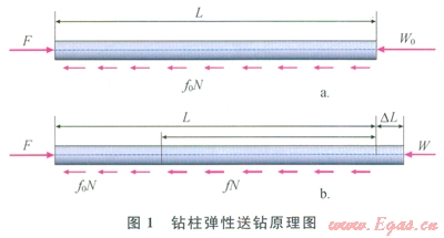 對于沒有加液力推進器或水力振蕩器的帶有井下動力的鉆具組合,在送到井底并加上鉆壓后,地面就暫停送鉆。此時,從地面看,鉆桿已經(jīng)停止運動,那么鉆頭是否也已經(jīng)停止鉆進?顯然不是,那么是什么在推動鉆頭前進?答案是鉆柱的彈性。鉆柱彈性送鉆原理如圖l所示。