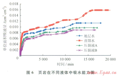 實(shí)驗(yàn)過(guò)程中使用的液體分別為蒸餾水、地層水、壓裂液A和壓裂液B。實(shí)驗(yàn)結(jié)果如圖6所示,頁(yè)巖在蒸餾水中的吸水能力最大,最大單位面積吸液量為0.0158cm3/cm2;在地層水中的吸水能力次之,最大單位面積吸液量為0.0114cm3/cm2;在壓裂液B中的吸水能力最弱,最大單位面積吸液量為0.009cm3/cm2。這與頁(yè)巖粉末樣品吸水膨脹能力測(cè)試的結(jié)果一致,說(shuō)明實(shí)驗(yàn)所用壓裂液能夠有效抑制頁(yè)巖的吸水。