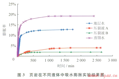 實(shí)驗(yàn)中使用的液體分別為蒸餾水、地層水、壓裂液A和壓裂液B,實(shí)驗(yàn)結(jié)果如圖3所示??梢钥吹巾?yè)巖在蒸餾水中的膨脹率最高,接近20%;而壓裂液中頁(yè)巖的膨脹率比地層水和蒸餾水明顯低很多,說(shuō)明了壓裂液在抑制頁(yè)巖吸水膨脹方面效果不錯(cuò)。