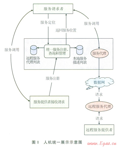 人機界面中的應用以插件方式集成到系統(tǒng)中,控制臺負責實現(xiàn)界面集成管理功能。人機應用通過服務接口層的服務代理與后臺服務進行交互,服務代理提供了訪問后臺服務的接口,其主要功能是接收人機應用的服務請求并將請求通過服務總線發(fā)送給后臺服務,然后接收服務應答并返凹給人機應用。服務代理屏蔽了訪問服務的細節(jié),使應用元需關(guān)心服務的具體部署信息以及訪問過程,因此有很好的服務訪問透明性。
