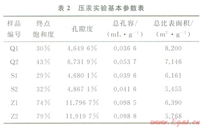 測試儀器為美國麥克爾儀器公司生產(chǎn)的Auto pore Ⅳ9505全自動壓汞儀,工作壓力范圍為0.000689~413.79MPa,孔徑測量范圍為5~360000nm,汞能進入的最小半徑為3nm。計算機控點式測量,高壓段選取壓力點36個,每點穩(wěn)定時間2s,樣品測試質(zhì)量3g左右。