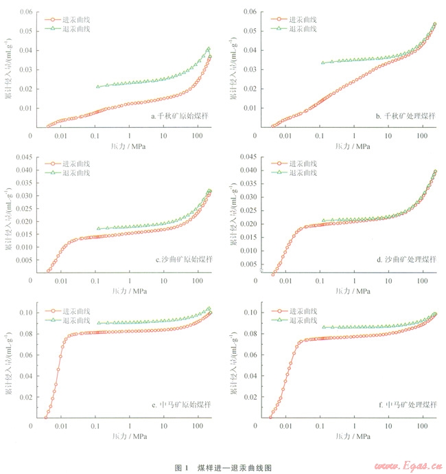 1)煤樣經(jīng)ClO2處理后進—退汞曲線開口變小,說明了煤樣的退汞效率提高,孔隙連通性增強,3種不同煤階處理煤樣的退汞效率比原煤樣均有所增加。在相同壓力下,3種不同煤階處理煤樣的進汞量均有增加,表明煤樣的孔隙度增加。