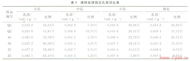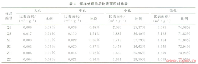 3)表3數(shù)據(jù)表明,大孔和中孔的孔容比均有增大,表明了處理后煤的孔裂隙得到了擴容,連通性增強,改善了儲層滲透性;表4數(shù)據(jù)表明小孔和微孔的比表面積比均有減小,表明煤對瓦斯的吸附容積減小,從而降低了煤對甲烷的吸附能力。