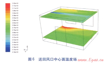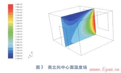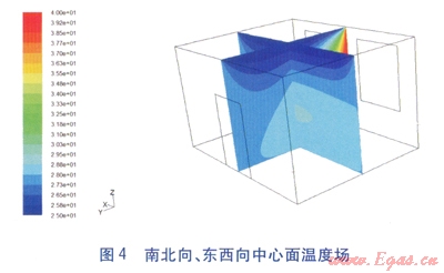由于室內(nèi)溫度場是三維場,因此選取其中最有代表性的3個切面進行分析:南北向及東西向的中心面、人員工作區(qū)距地面1.5m的平面。南北向中心面溫度場見圖3,南北向、東兩向中心面溫度場見圖4,1.5m高度處溫度場見圖5。