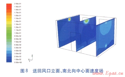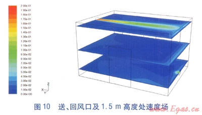 送回風口中心面溫度場見圖6,南北向、東西向中心面溫度場見圖7。送回風口立面、南北向中心面速度場見圖8,東西向中心面速度場見圖9,送、回風口及1.5m高度處速度場見圖l0。由圖6、7可知,采用新風除濕輔助毛細管輻射供冷系統(tǒng)的房間,室內(nèi)溫度在舒適范圍內(nèi),垂直方向溫度梯度小,舒適性更強。由圖8~10可知,工作區(qū)內(nèi)風速在0.3m/s左右,無吹風感。