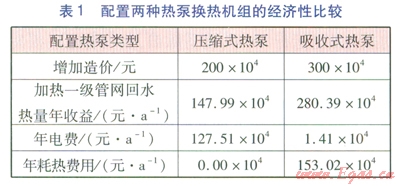 配置兩種熱泵換熱機組的經(jīng)濟性比較見表l,熱價按57.92元/GJ計算,電價按0.854元(kW·h)計算。由表1可計算得,配置壓縮式熱泵的換熱機組年凈收益為20.48×104元/a,增加造價200×104元,投資回收期約l0a。配置吸收式熱泵的換熱機組年凈收益為l25.96×104元/a,增加造價300×104元,投資回收期約3a。