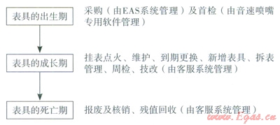 如何實(shí)現(xiàn)這一管理目標(biāo)呢?信息化建設(shè)必然首當(dāng)其沖。通過(guò)建設(shè)和完善現(xiàn)有的客戶綜合管理信息平臺(tái),實(shí)現(xiàn)燃?xì)獗硇畔⑷鞒坦蚕砉芾?。目前已設(shè)計(jì)并實(shí)現(xiàn)了燃?xì)獗硎状螔毂?、日常換表、到期表更換、新增表具、拆表管理、整樓拆除、工商戶流量計(jì)周檢管理和日常維護(hù)、報(bào)廢表具核銷等業(yè)務(wù)模塊,初步建立了完整的燃?xì)獗砭呷芷诠芾砹鞒?,并與EAS財(cái)務(wù)系統(tǒng)數(shù)據(jù)共享,為“燃?xì)獗砭呷芷诠芾?rdquo;提供了操作平臺(tái)。燃?xì)獗砣芷诘幕竟芾砜蚣芤殉醪叫纬?,如下?span lang="EN-US">