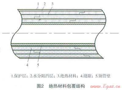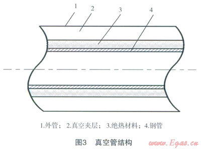 LNG槽車到站后,通常通過低溫泵法或增壓器法對槽車內(nèi)LNG增壓后將LNG卸入儲罐內(nèi)。不論采用哪種方法,LNG必須通過低溫管道進(jìn)行輸送,在輸送過程中,LNG將吸收外界環(huán)境熱量而氣化,產(chǎn)生BOG。為了減少BOG的產(chǎn)生,通常利用兩種方法對低溫管道進(jìn)行保冷處理,即絕熱材料包覆法和真空管法,這兩種方法結(jié)構(gòu)如圖2、3所示[5]。