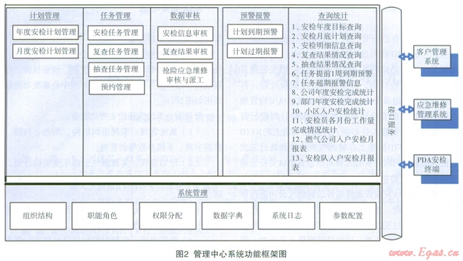 根據(jù)燃?xì)夤拘枨?,管理中心系統(tǒng)由系統(tǒng)管理、計(jì)劃管理、任務(wù)管理、數(shù)據(jù)審核管理、預(yù)警報(bào)價(jià)、查詢(xún)統(tǒng)計(jì)和接口服務(wù)等模塊構(gòu)成。管理中心系統(tǒng)功能框架圖如圖2所示。