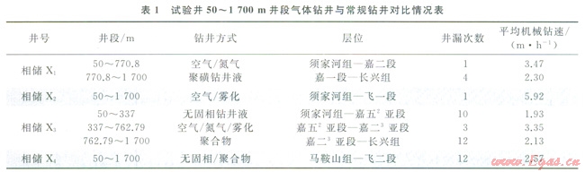 由表l可知,氣體鉆井在上部地層防漏效果非常好。例如,相儲(chǔ)X1井在須家河組—嘉二段采用氣體鉆井進(jìn)尺720.8m,僅漏失l次,平均機(jī)械鉆速3.47m/h,而相儲(chǔ)X3井在50~387m采用無(wú)固相鉆井液鉆井漏失l0次,平均機(jī)械鉆速僅為l.93m/h。通過(guò)50~1700m井段氣體鉆井與常規(guī)鉆井對(duì)比分析可知,氣體鉆井既克服了上部地層漏欠層的惡性井漏問(wèn)題,保證了安全鉆進(jìn),而且大幅度提高了機(jī)械鉆速、縮短了鉆井周期。