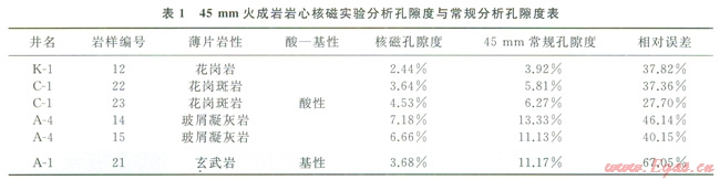 6塊巖心核磁實(shí)驗(yàn)孔隙度與常規(guī)分析孔隙度對比看出,火成巖核磁實(shí)驗(yàn)孔隙度明顯低于常規(guī)分析的孔隙度(表1),并且基性巖(21號巖樣)減小的程度要明顯的大于酸性巖(如表l中的12、22、23號巖樣)。這是因?yàn)?,基性玄武巖的磁化率高,孔隙內(nèi)部梯度磁場強(qiáng),核磁信號衰減幅度大。